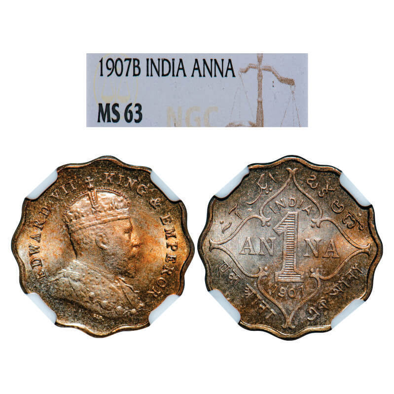 Edward VII, Copper-Nickel, 1 Anna, 1907, Bombay Mint, 'B' incused. GK 990, F. Prid 926. NGC Slabbed MS 63. Rare.