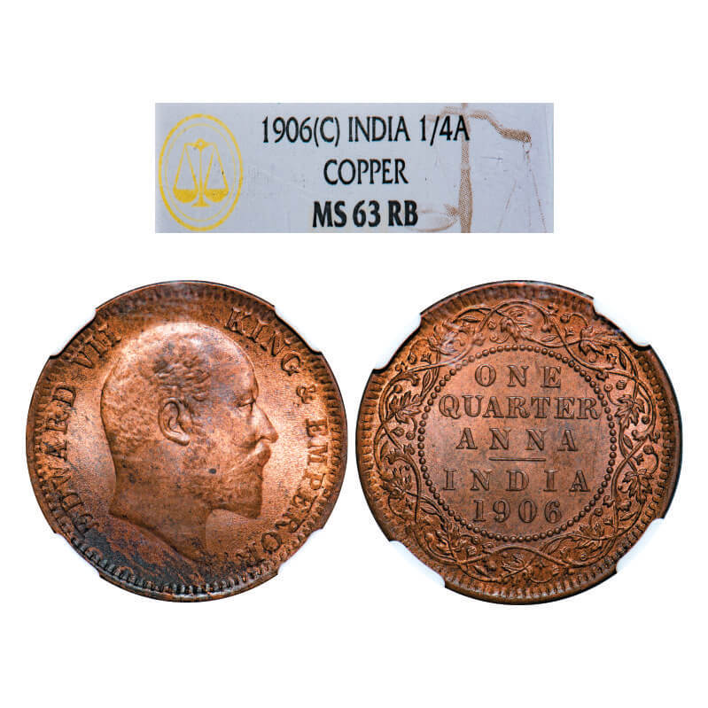 Edward VII, Copper, Quarter Anna, 1906, Calcutta Mint, No mint mark. GK 997, F.Prid 650. NGC Slabbed MS 63 RB. Rare.