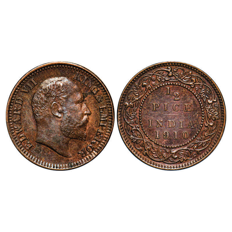 Edward VII, Bronze, ½ Pice, 1910, Calcutta Mint, No mint mark, Multiple die cracks on Obv, Slightly misaligned die on Obv. GK 1011, F. Prid 744. Almost Uncirculated. Scarce.
