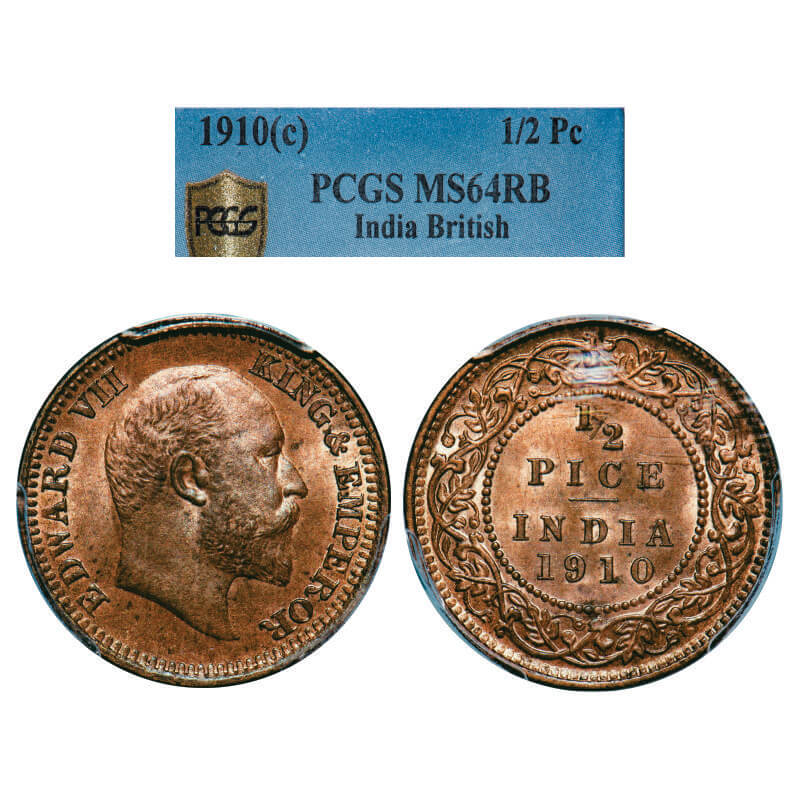 Edward VII, Bronze, 1/2 Pice, 1910, Calcutta Mint, No mint mark. GK 1011, F. Prid 744. PCGS Slabbed MS 64 RB. Very Rare.