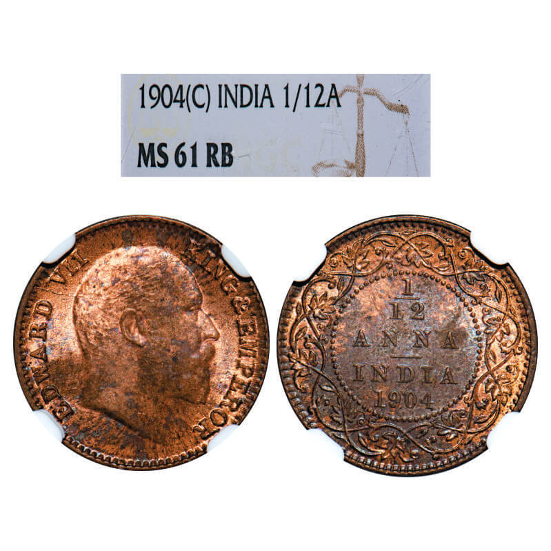 Edward VII, Copper, 1/12 Anna, 1904, Calcutta Mint, No mint mark. GK 1013, F. Prid 814. NGC Slabbed MS 61 RB. Very Scarce.