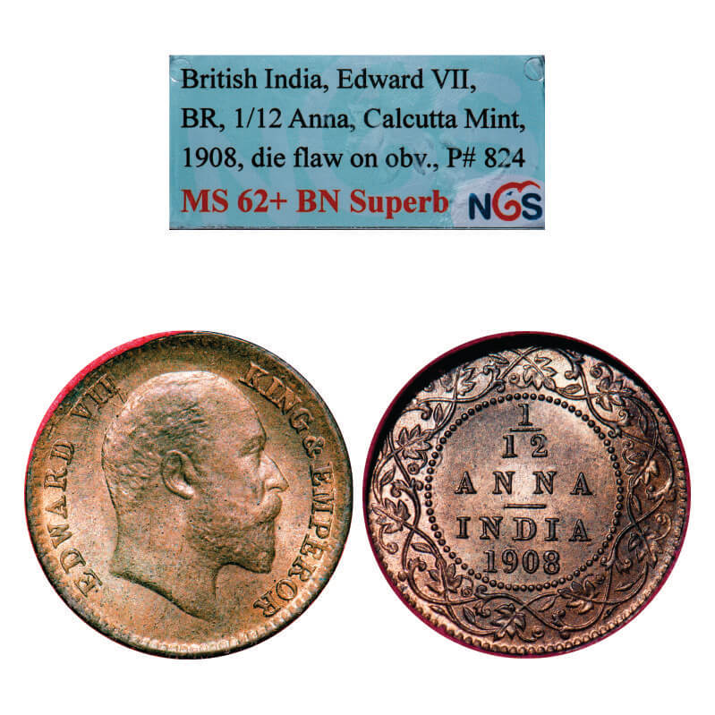 Edward VII, Bronze, 1/12 Anna, 1908, Calcutta Mint, No mint mark, Die flaw on Obv mentioned on the slab. GK 1018, F. Prid 824. NGS Slabbed MS 62+ BN Superb. Very Scarce.