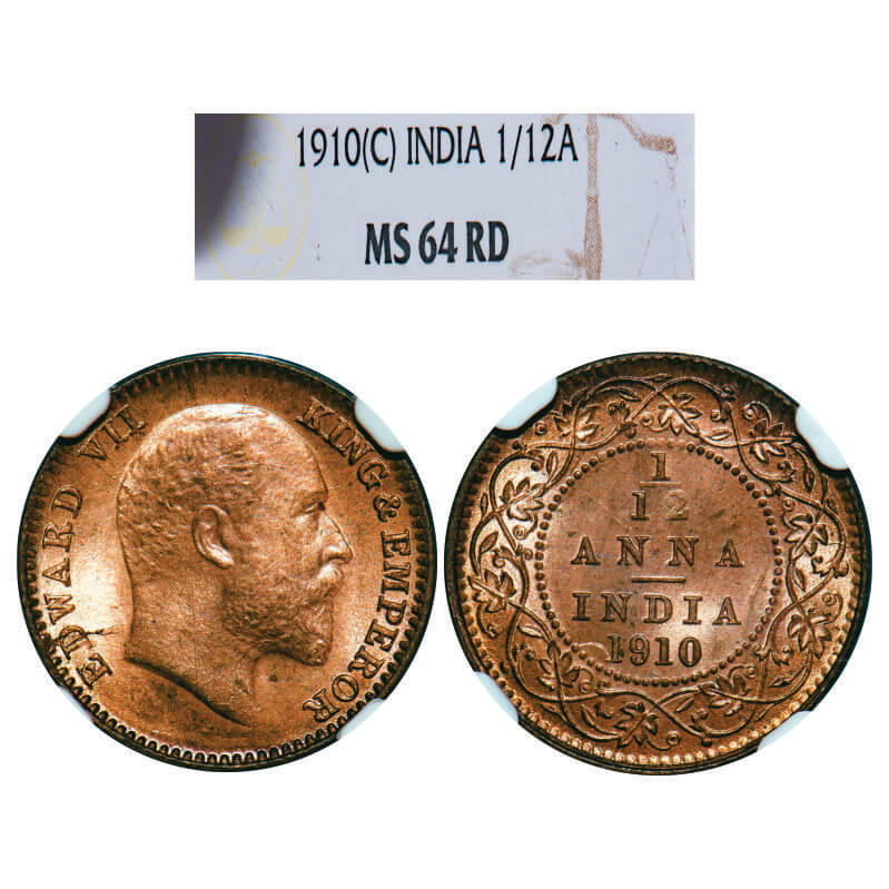 Edward VII, Bronze, 1/12 Anna, 1910, Calcutta Mint, No mint mark. GK 1020, F. Prid 826. NGC Slabbed MS 64 RD. Rare.