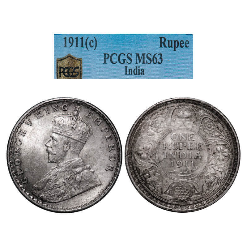George V, Silver, Rupee, 1911, Calcutta Mint, No dot, Pig-Type. GK 1021, F. Prid 207. PCGS Slabbed MS 63. Very Rare.