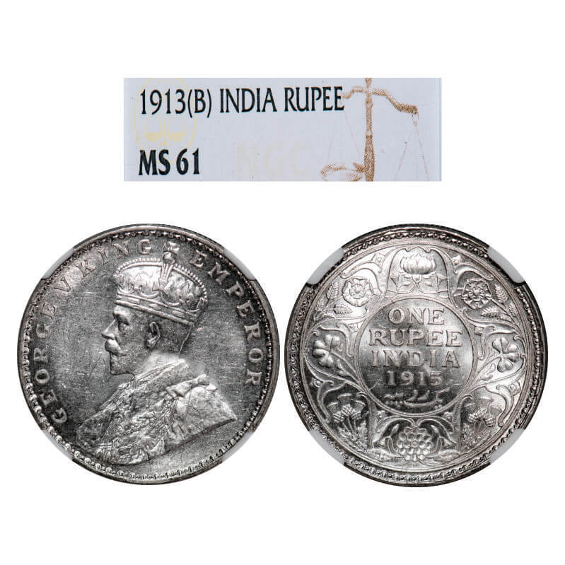 George V, Silver, Rupee, 1913, Bombay Mint, Dot. GK 1028, F. Prid 249. NGC Slabbed MS 61. Rare.