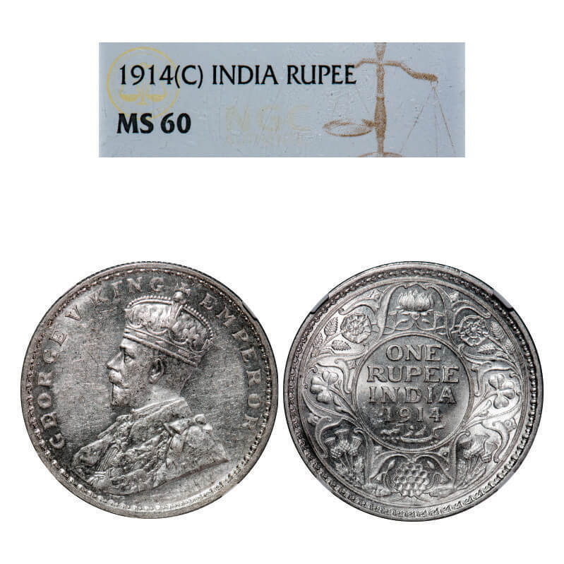 George V, Silver, Rupee, 1914, Calcutta Mint, No dot. GK 1029, F. Prid 210. NGC Slabbed MS 60. Rare.
