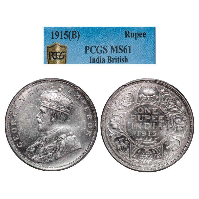 George V, Silver, Rupee, 1915, Bombay Mint, Dot. GK 1032, F. Prid 221. PCGS Slabbed MS 61. Rare.