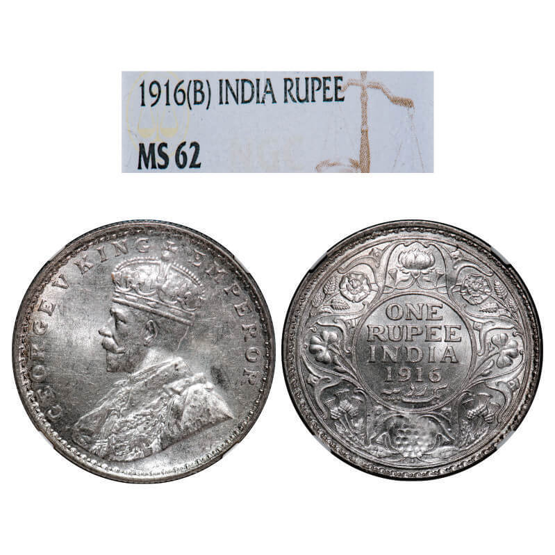 George V, Silver, Rupee, 1916, Bombay Mint, Dot. GK 1034, F. Prid 222. NGC Slabbed MS 62. Rare.