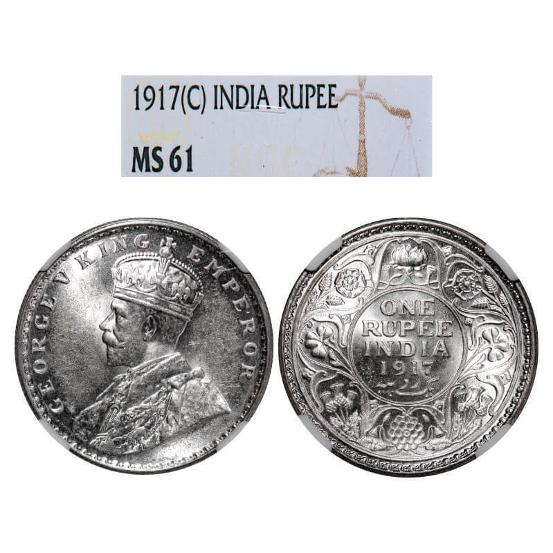 George V, Silver, Rupee, 1917, Calcutta Mint, No dot. GK 1035, F. Prid 213. NGC Slabbed MS 61. Rare.