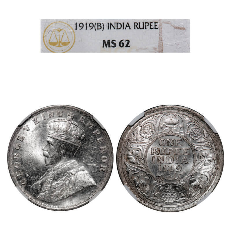 George V, Silver, Rupee, 1919, Bombay Mint, Dot. GK 1040, F. Prid 225. NGC Slabbed MS 62. Rare.
