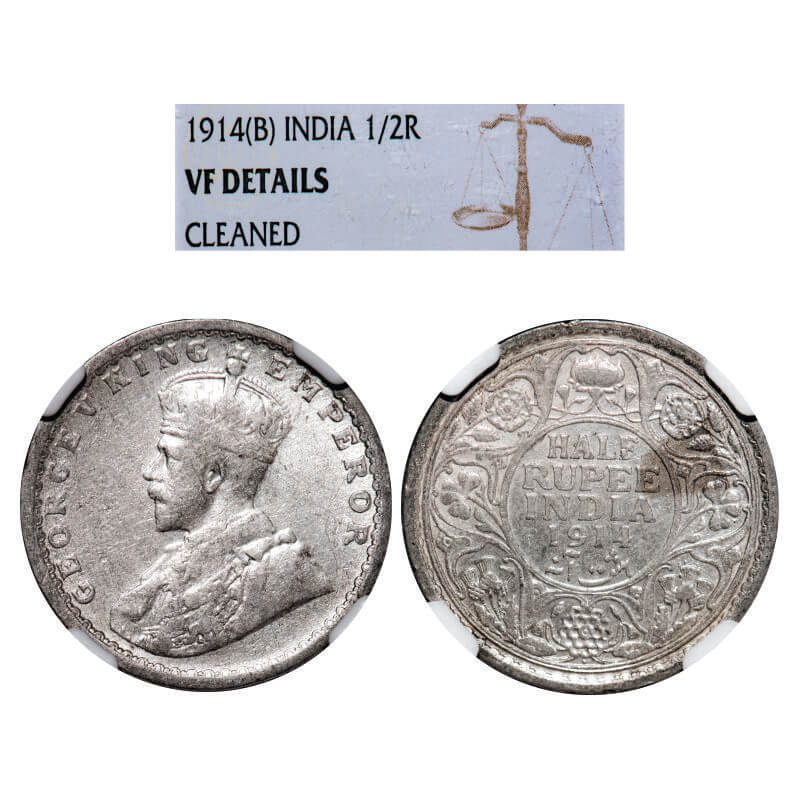 George V, Silver, Half Rupee, 1914, Bombay Mint, Dot. GK 1051, F. Prid 338. NGC Slabbed VF Details, Cleaned. Scarce.