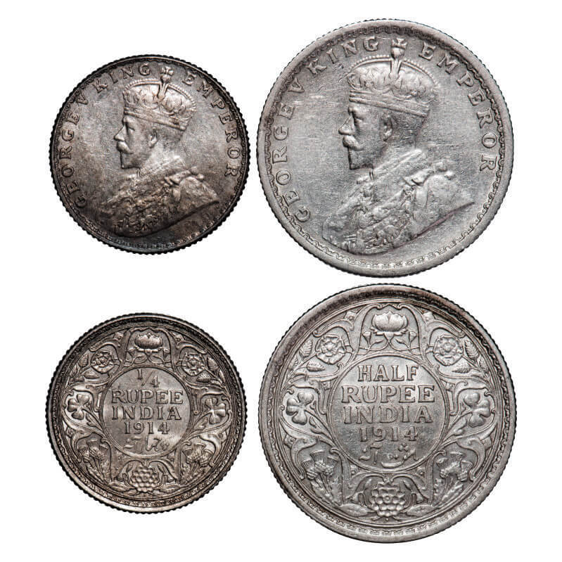 | George V, Silver, Half Rupee, 1/4 Rupee, (2 coins), 1914, Bombay Mint, Dot. GK 1051, 1086, F. Prid 338, 456. Extremely Fine+ to Almost Uncirculated, Toned. Scarce. |