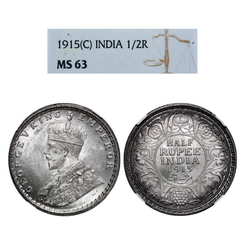 George V, Silver, Half Rupee, 1915, Calcutta Mint, No dot. GK 1052, F. Prid 322. NGC Slabbed MS 63. Extremely Rare.