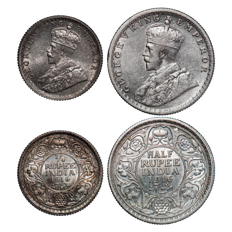 | George V, Silver, Half Rupee, 1/4 Rupee, (2 coins), 1916, Calcutta Mint, No dot. GK 1053, 1089, F. Prid 323, 445. Extremely Fine+ to Uncirculated. Scarce. |