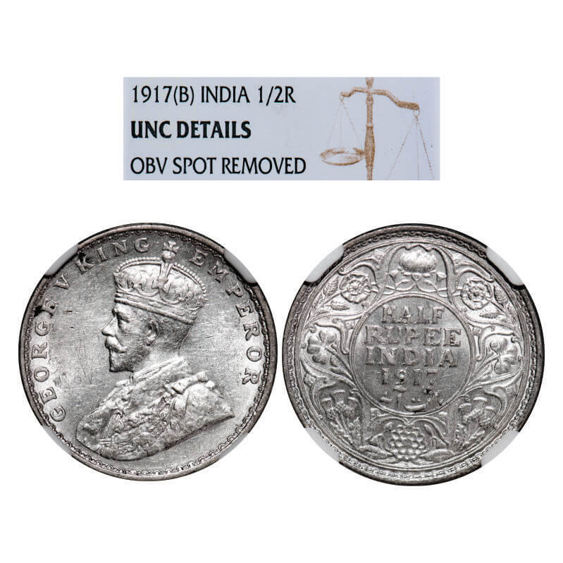 George V, Silver, Half Rupee, 1917, Bombay Mint, Dot. GK 1055, F. Prid 341. NGC Slabbed UNC Details, Obv spot removed. Scarce.