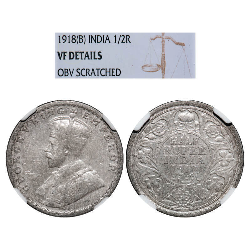 George V, Silver, Half Rupee, 1918, Bombay Mint, Dot. GK 1056, F. Prid 342. NGC Slabbed VF Details, Obv scratched. Scarce.