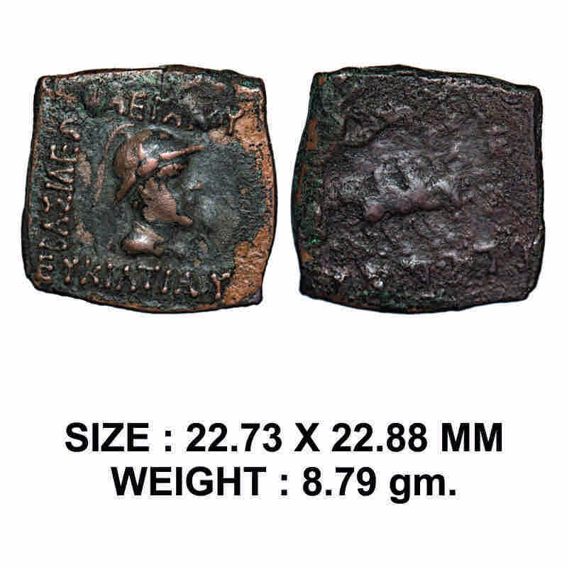 Indo-Greek, Eucratides I, Copper Drachma, 8.79g, Obv: Bust of King with wearing crested helmet and Greek legend BASI?EOS MEGA?OY EYKPATI?OY, Rev: Dioscuri mounted on horses prancing right. Holding palms and spears, Kharoshthi legend Maharajasa Evukratidasa. Bopearachchi & Rahman 271. About Very Fine, Scarce.