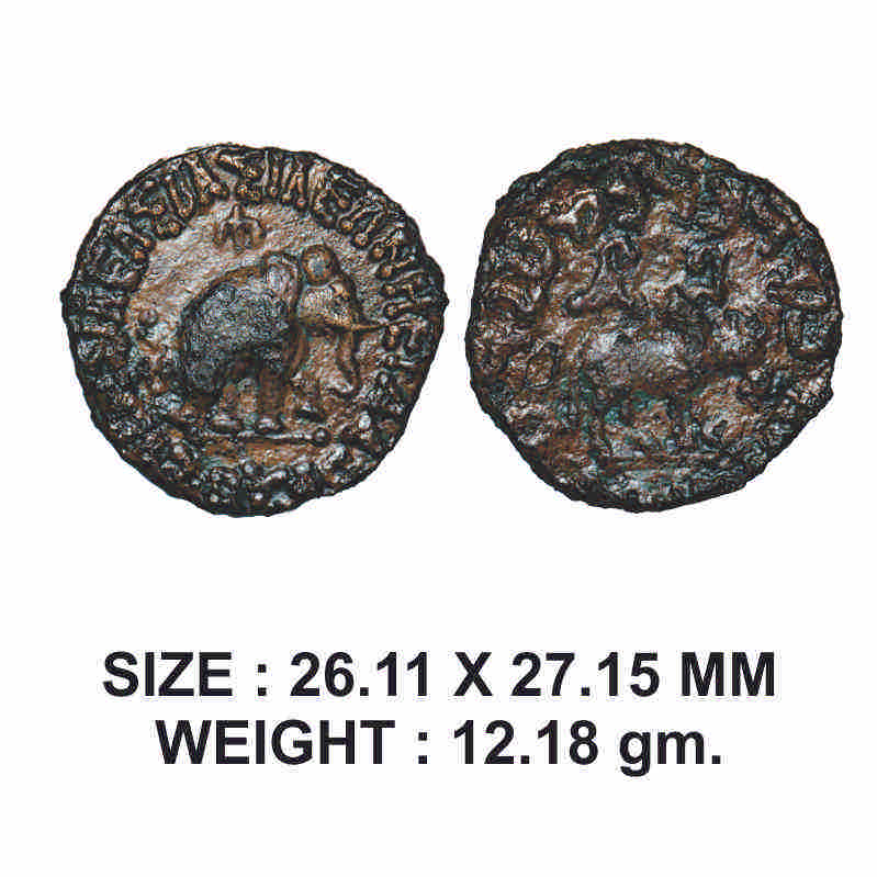 Indo Scythian, Azes II (35-12 BC), Pentachalkon, 12.18g, Obv: Elephant standing right greek legend around, Rev: Humped bull standing right kharoshthi legend 'Maharajasa rajatirajasa mahatasa ayasa', monogram above. (Mitch. Vol. 6 # Type 817e/MACW # 2298). About Very Fine, Scarce.
