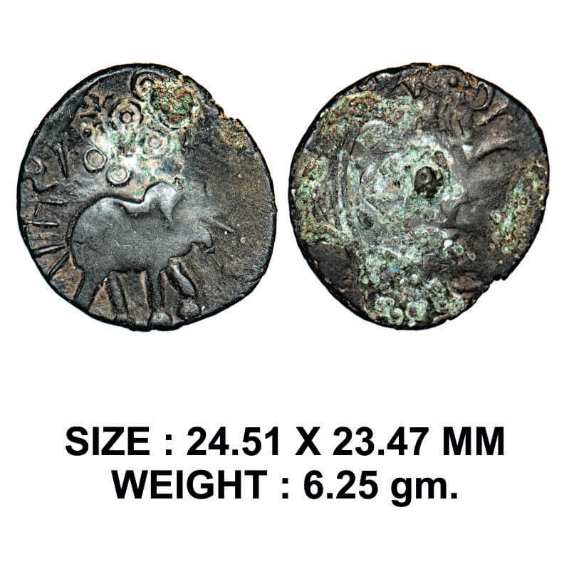 | Satavahanas, Siri Satakarni, Nasik Region, Elephant type, Potin Unit, 6.25g, Over struck type, Obv: Elephant walking to right side above ujjaini symbol, above Brahmi legend 'Rajno Siriā¦', Rev: Tree-in-railing with bold leaves and traces of Brahmi legend. I.K. Sharma, pl. VII. About Very Fine, Scarce. |