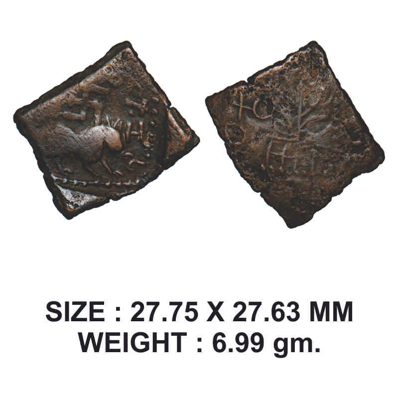 | Satavahanas, Siri Satakarni, Nasik Region, Lion type, Copper Unit, 6.99g, Obv: Lion walking to right side above swastika symbol and Brahmi legend front of lion '….takanisa', Rev: Tree-in-railing and ujjaini symbol. About Extremely Fine, Rare. |