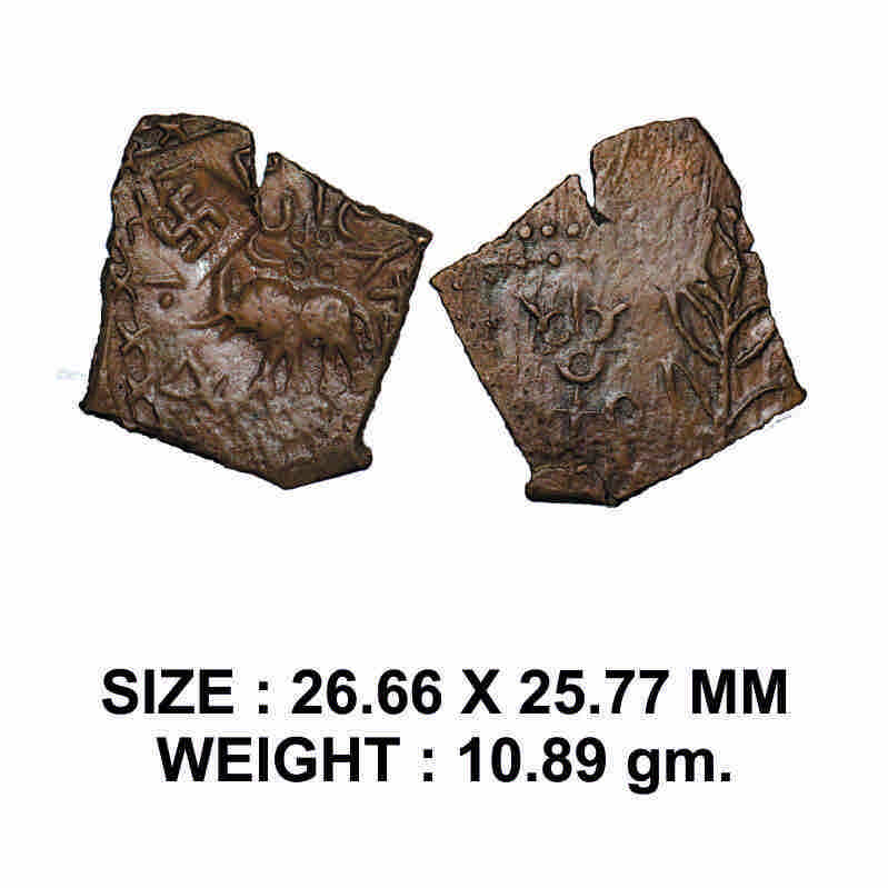 | Satavahanas, Siri Satakarni, Nasik Region, Copper Unit, 10.89g, Obv: Elephant walking to left side below Indradhvaja, swastika symbol as a counter mark, ujjaini symbol above elephant and Brahmi legend '[Rajno] Siri Satakanisa', Rev: Tree-in-railing, ujjaini and three circles attached. Very Fine+, Scarce. |