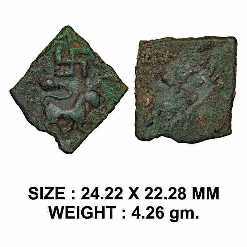 | Satavahanas, Siri Satakarni, Nasik Region, Lion type, Copper, 4.26g, Obv: Lion walking to right side with curved tail above bold swastika symbol and on top traces of Brahmi legend, Rev: Worn out. I.K. Sharma, pl. VIII. About Very Fine, Scarce. |