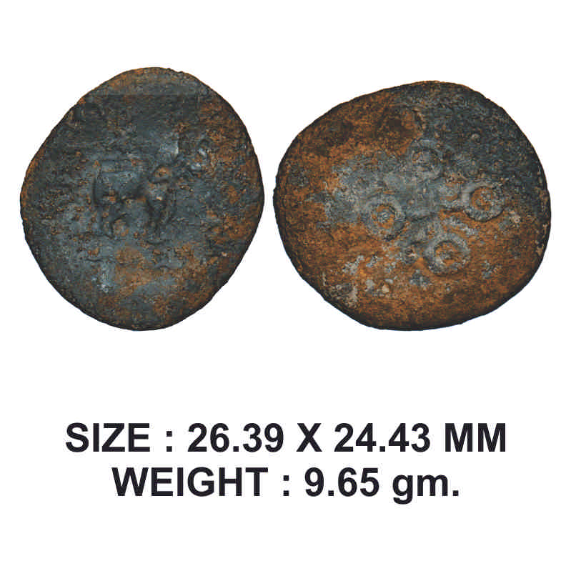 Satavahanas, Kosikiputra Siri Satakarni, Lead Unit, 9.65g, Obv: Elepahnt walking to right side with trunk upraised, above tree arched hill and around traces of Brahmi legend, Rev: Four orbed ujjaini symbol. About Very Fine, Scarce.