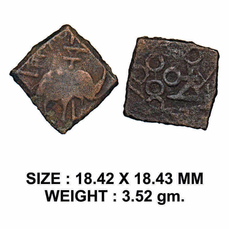 | Satavahanas, Siri Satakarni, Nasik Region, Elephant type, Copper Unit, 3.52g, Obv: Elephant walking to right side with trunk upraised above Indradhvaja and Brahmi legend 'Rajno Siri sa', Rev: Indradhvaja and ujjaini symbol with crescent. About Very Fine, Scarce. |