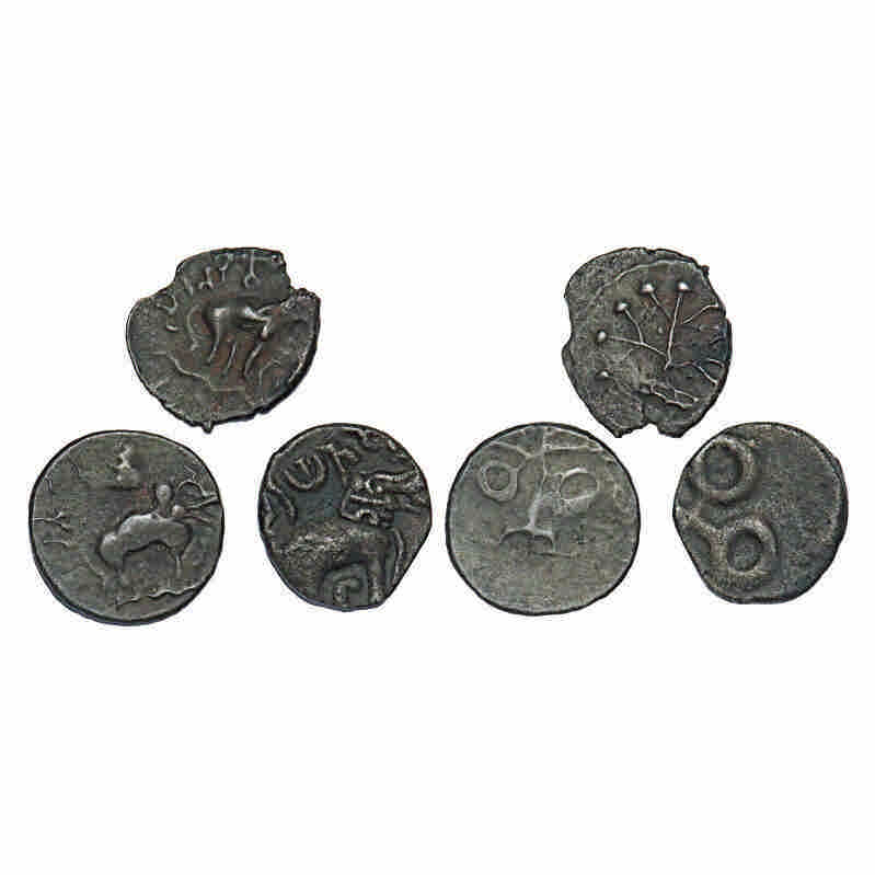 Satavahanas, Siri Satakarni & Yajna Satakarni, Potin Unit (3 coin), Nasik & Tarhala type, Obv: Elephant walking to right side above Brahmi legend, Rev: Ujjaini symbol, Tree-in-railing symbol respectively. About Very Fine, Scarce.