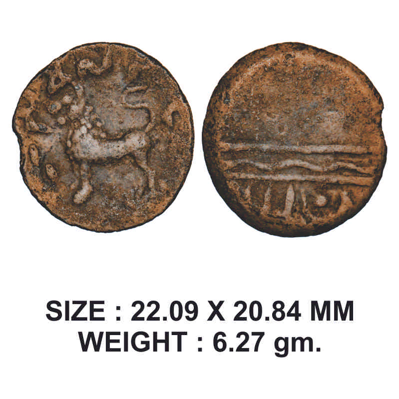 | Feudatories of Satavahana’s, Kumara Isamahisa (c. 80 AD), Lead Unit, 6.27g, Karad Region, Obv: Lion facing to left side with curved tail around Brahmi legend 'Isamahisa', Rev: Tree-in-railing with compartments (partly visible). Mitch, K&A, 121. About Very Fine, Rare. |