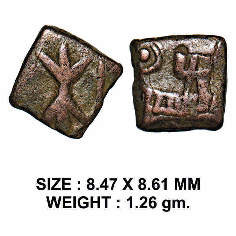 Western Kshatrapas, Bhumaka, Copper, 1.26g, Obv: Arrow and thunderbolt, Rev: Lion-wheel standard. About Very Fine, Scarce.