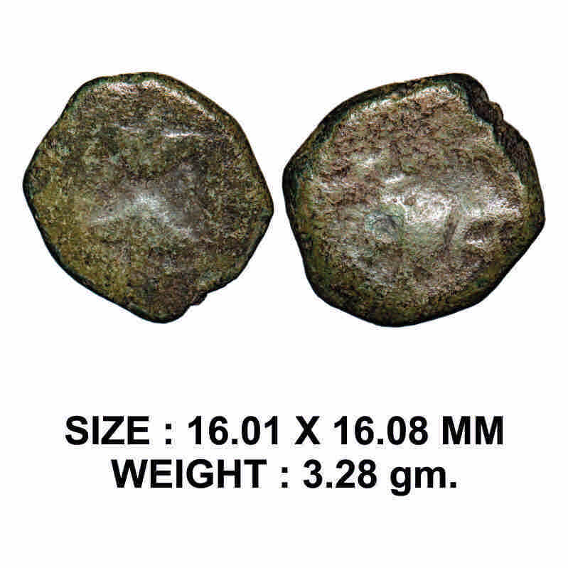 Western Kshatrapas, Bhumaka, Copper Unit, 3.28g, Obv: Arrow and thunderbolt around gtraces of Brahmi legend, Rev: Lion-wheel standard. Fine+, Scarce.