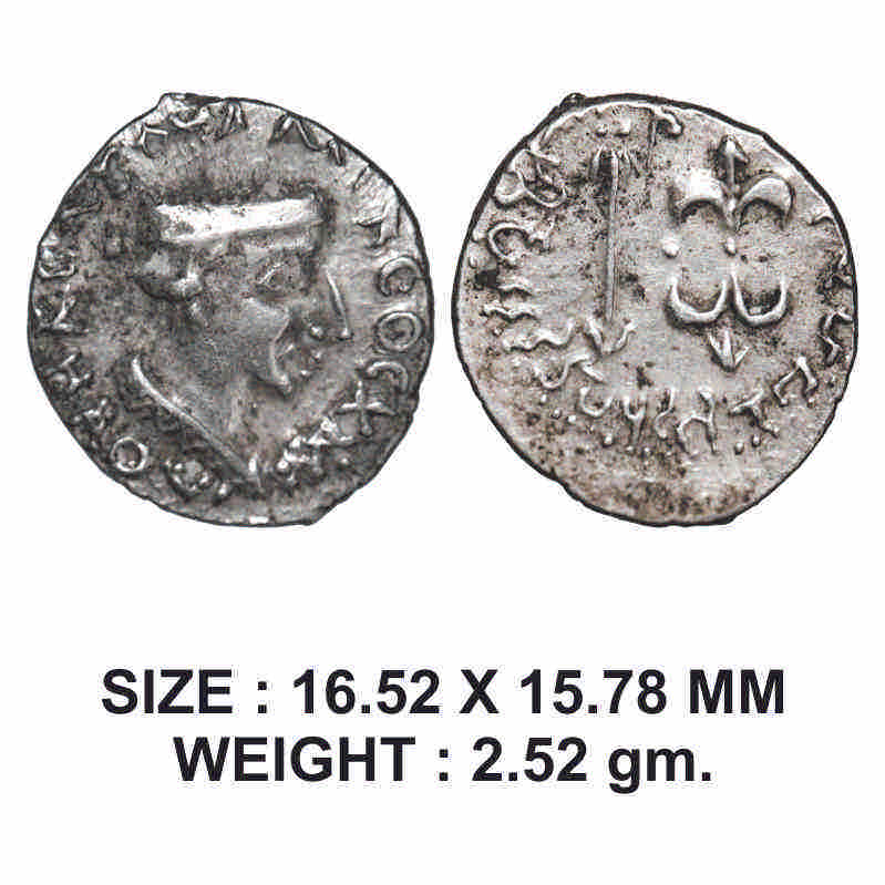 Western Kshatrpas, Nahapana (c. 50-95 AD), Silver Drachms, 2.52g, Obv: Bust of Nahapana facing to right, around corrupt Greek inscriptions, Rev: Arrow and thunderbolt with Kharoshti legend and Brahmi legend '... nahapanasa'. Very Fine, Scarce.