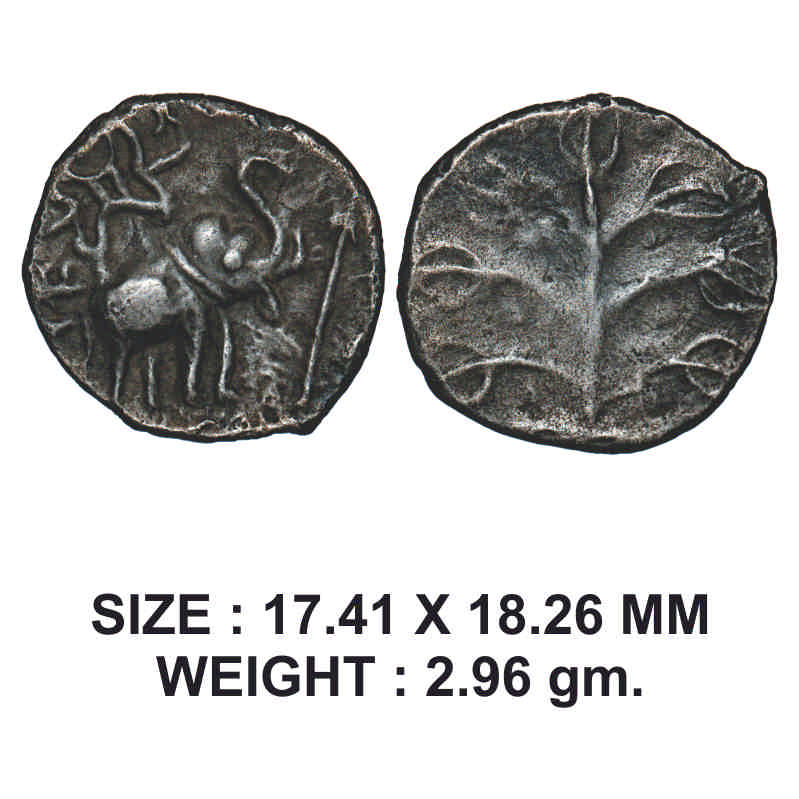 | Western Kshatrapas, Nahapana, Potin Unit, 2.96g, Junnar Region, Obv: Elephant walking to right with trunk upraised, thunderbolt and arrow above elephant with Brahmi legend around, Rev: Tree in railing with big leaves within circle. A.M. Fishman, 6.4 var. About Very Fine, Scarce. |