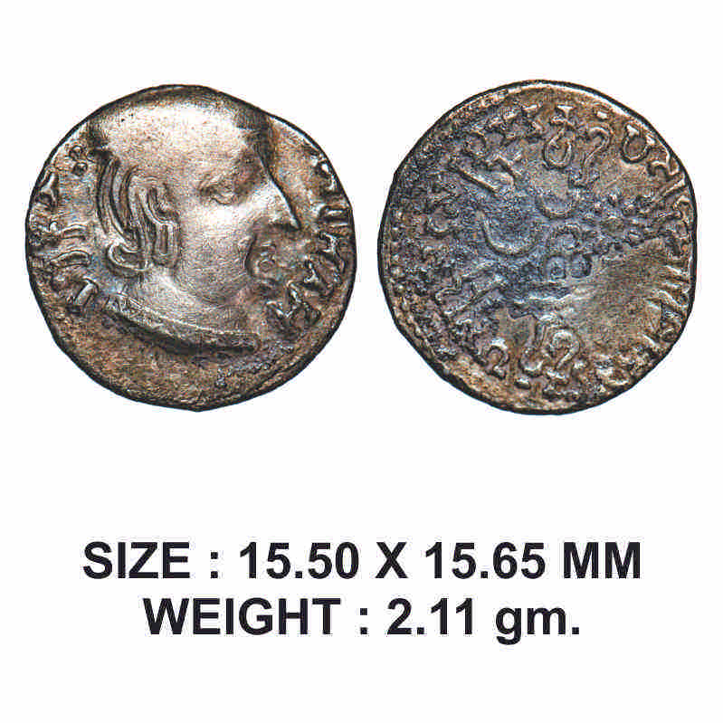 | Western Kshatrapas, Kardamaka Dynasty, Rudrasimha I (c. 177-198 AD), son of Rudradaman I, Silver Drachma, 2.11g, SE 104, Obv: Bust of king facing to right side date digit behind with corrupt Greek letters, Rev: three arched hill with crescent in centre, moon to left and sun to right, around Brahmi legend ‘Rajno Mahakshatrapasa Rudradamnaputrasa Rajno mahakshatrapasa Rudrasihasa'. Very Fine, Scarce. |