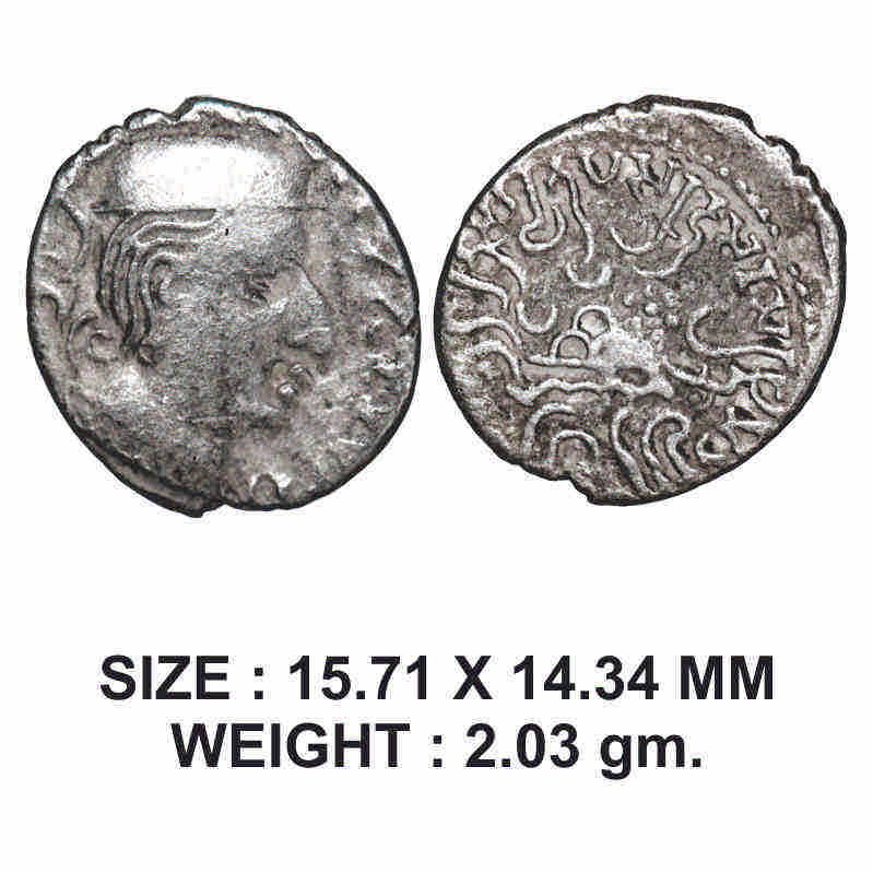 | Western Kshatrapas, Kardamaka Family, Rudrasena I, son of Rudrasimha I, Silver Drachma, 2.03g, Obv: Bust of King facing right & date behind with corrupt Greek legend around, Rev: Three arched hill with crescent in centre, moon to left and sun to right and around Brahmi legend 'Rajno Mahakshatrapasa Rudrasihasaputrasa Rajno Mahakshatrapasa Rudrasenasa'. About Very Fine, Scarce. |