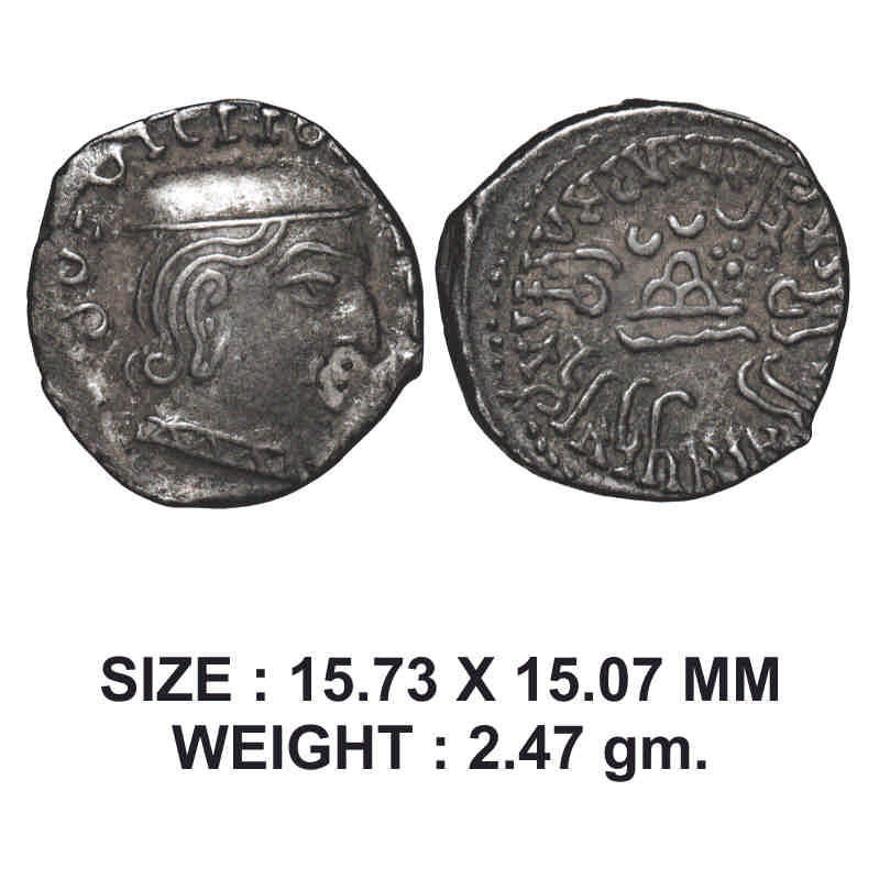 | Western Kshatrapas, Damasena s/o Rudrasimha I (c. 222-238 AD), Kardamaka Family, SE 152, Silver Drachma, 2.47g, Obv: Bust of king facing to right behind date digit with corrupt Greek legend, Rev: Three arched hill with sun and moon, around Brahmi legend ‘Rajno Mahakshatrapasa Rudrasihasaputrasa Rajno Mahakshatrapasa Damsenasa’. Extremely Fine, Very Scarce. |