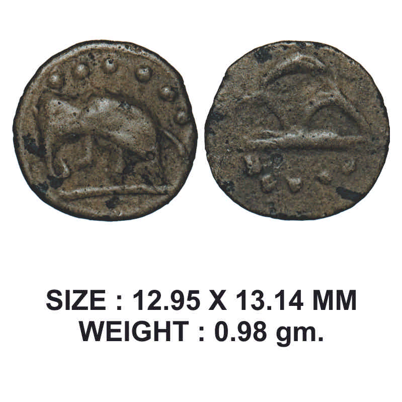 Western Kshatrapas, Probably Damasena Issue, Lead Unit, 0.98g, Obv: Elephant standing on platform facing to left side, above dotted line, Rev: Three arched hill below five dots. A.M. Fishman, 23.12. About Very Fine, Scarce.