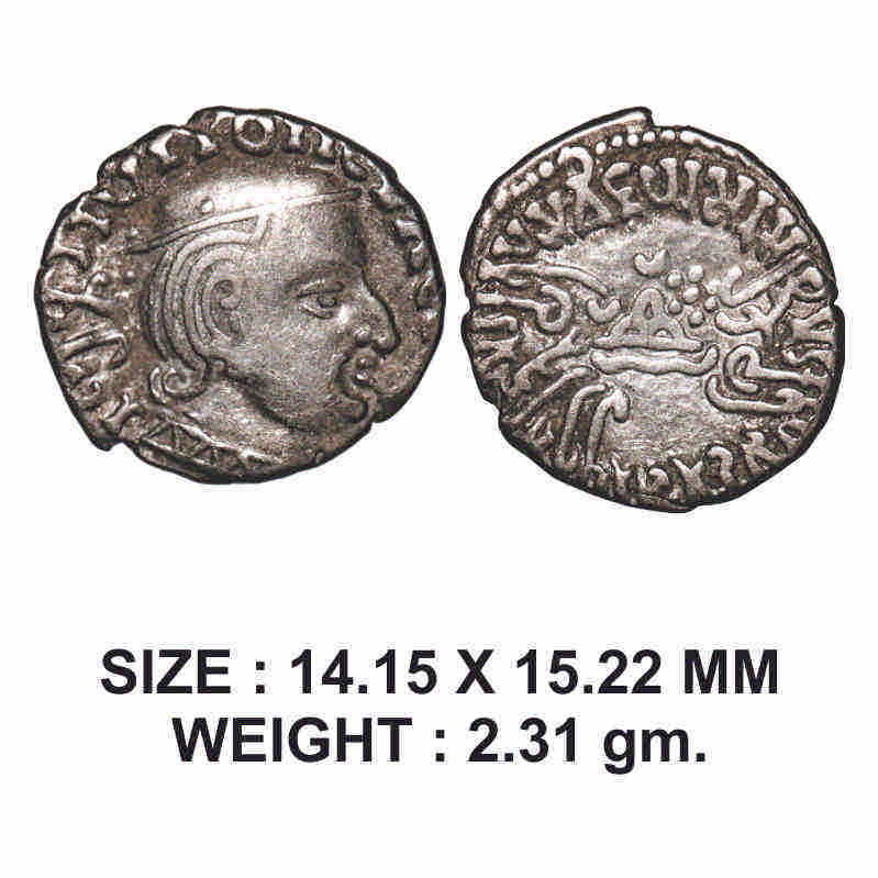 | Western Kshatrapas, Kardamaka Dynasty, Vijayasena (c. 238-239 AD), son of Damsena, Silver Drachma, 2.31g, SE 170, Obv: Bust of king facing to right, corrupt Greek legend around, Rev: Three arched hill with crescent in centre, moon to left and sun to right, around Brahmi legend ‘Rajno Mahakshatrapasa Damasenasaputrasa Rajnah Kshatrapasa Vijayasenasa’. About Very Fine, Scarce. |