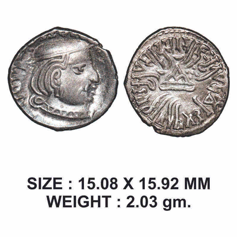 | Western Kshatrapas, Kardamaka Dynasty, Rudrasena II (c. 255-276 AD), son of Viradaman, Silver Drachma, 2.03g, SE 187, Obv: Bst of king facing to right behind date digit, Rev: Rajnah kshatrapasa Viradamaputrasa Rajno Mahakshatrapasa Rudrasenasa’. Almost Mint State, Scarce. |