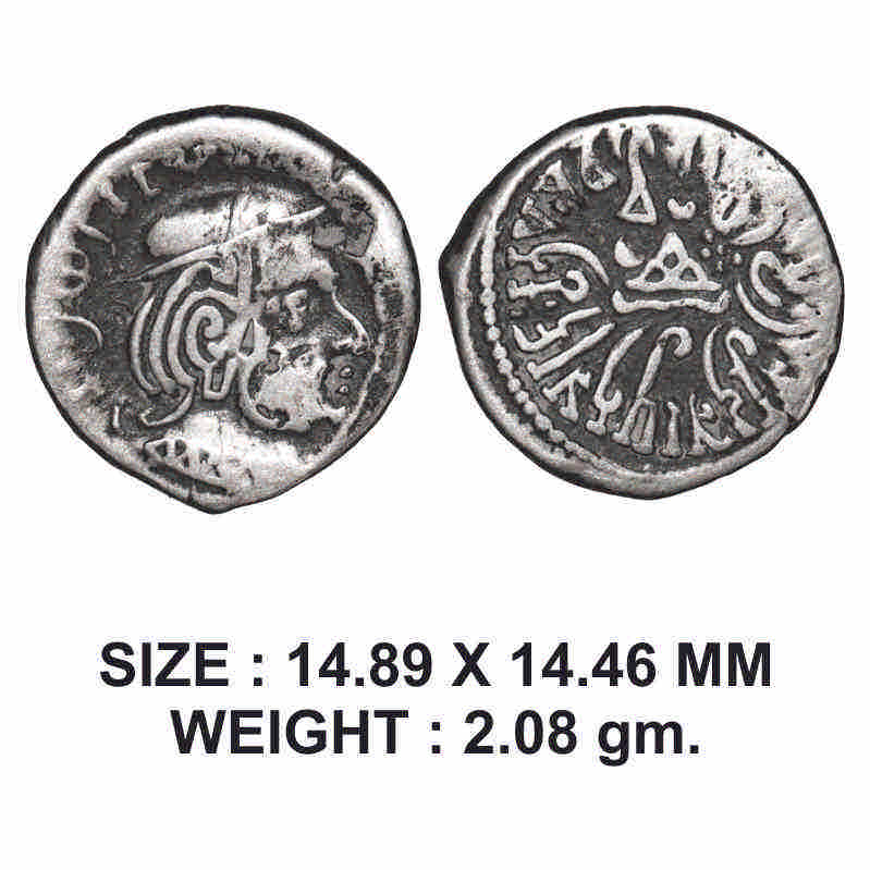 | Western Kshatrapas, Kardamaka Family, Vishvasimha II, son of Rudrasena II (275-280 AD), as Kshatrapa, SE 197, Silver Drachma, 2.08g, Obv: Bust of the king facing right, date behind, corrupt Greek legend around, Rev: Three arched hill with crescent in centre, moon to left and sun to right, Brahmi legend in Prakrit Rajno Mahakshatrapasa Rudrasenaputrasa Rajna Kshatrapasa Vishvasihasa. About Very Fine, Scarce. |