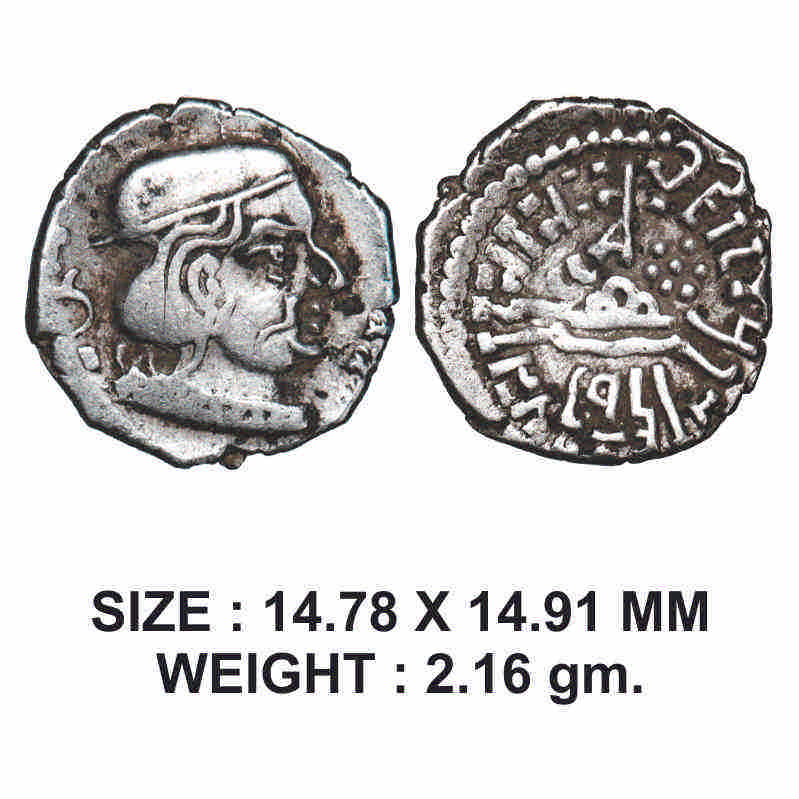 | Western Kahatrapas, Karddamaka Dynasty, Rudrasimha II (c. 304-316 AD), son of Svami Jivadaman, Silver Drachma, 2.16g, Obv. Bust of king facing right behind date digit, Rev: Three arched hill with crescent in centre, moon to left and sun to right, around Brahmi legend ‘Svami Jivadamaputrasa Rajnah Kchatrapasa Rudrasihasa'. A. Fishman, Type 31.2. About Very Fine, Scarce. |