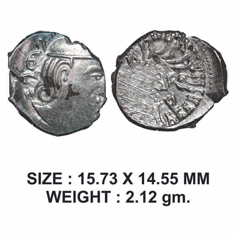 | Western Kshatrapa, Svami Rudrasena III (c. 348-378 AD) son of Svami Rudradaman II, SE 287, Silver Drachma, 2.12g, Obv: Bust of the king facing to right, Rev: Three arched hill with sun and moon, around Brahmi legend ‘[Rajna Mahakshatrapasa Svami]Rudradamaputrasa Rajna Mahakshatrapasa Svami Rudrasenasa’. Fine+, Scarce. |