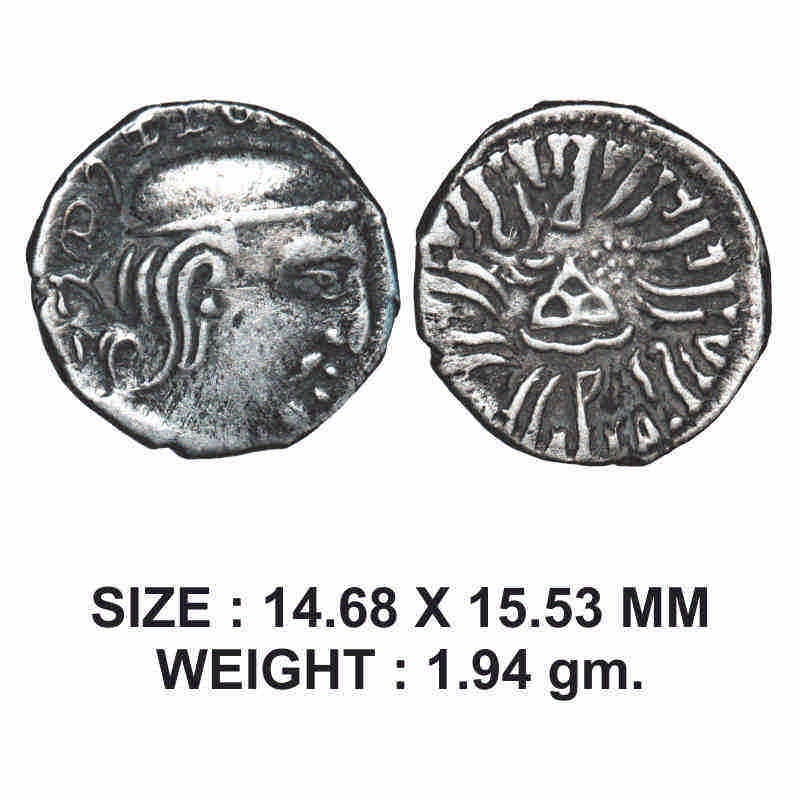 | Western Kshatrapa, Svami Rudrasena III (c. 348-378 AD) son of Svami Rudradaman II, SE 287, Silver Drachma, 1.94g, Obv: Bust of the king facing to right, Rev: Three arched hill with sun and moon, around Brahmi legend ‘Rajna Mahakshatrapasa SvamiRudradamaputrasa Rajna Mahakshatrapasa Svami Rudrasenasa’. About Very Fine, Scarce. |