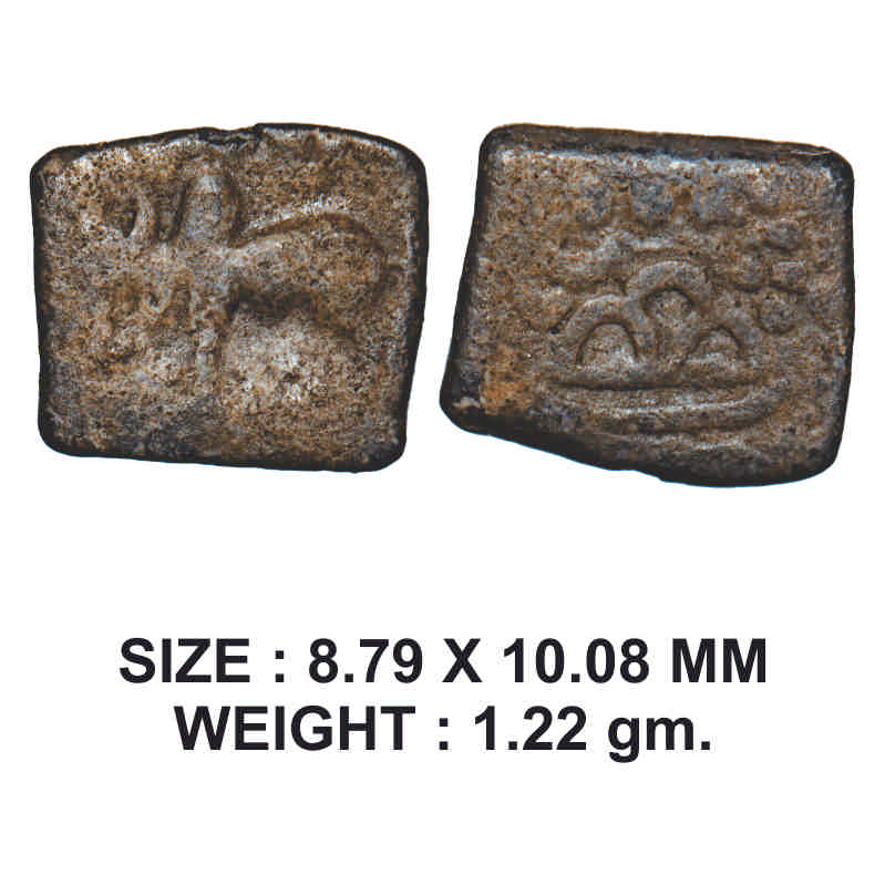 Western Kshatrapas, Rudrasena III, Lead, 1.22g, Obv: Humped bull walking to left side, Rev: Three arched hill with sun and moon below zig zag line. About Very Fine, Scarce.