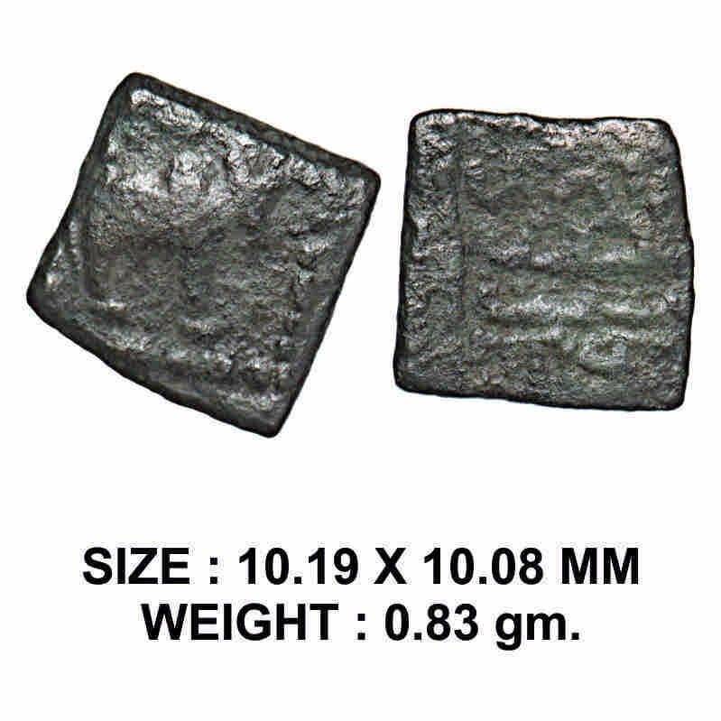 Western Kshatrapas, Rudrasena III, Lead Unit, 1.28g, Obv: Humped bull standing facing to right side...