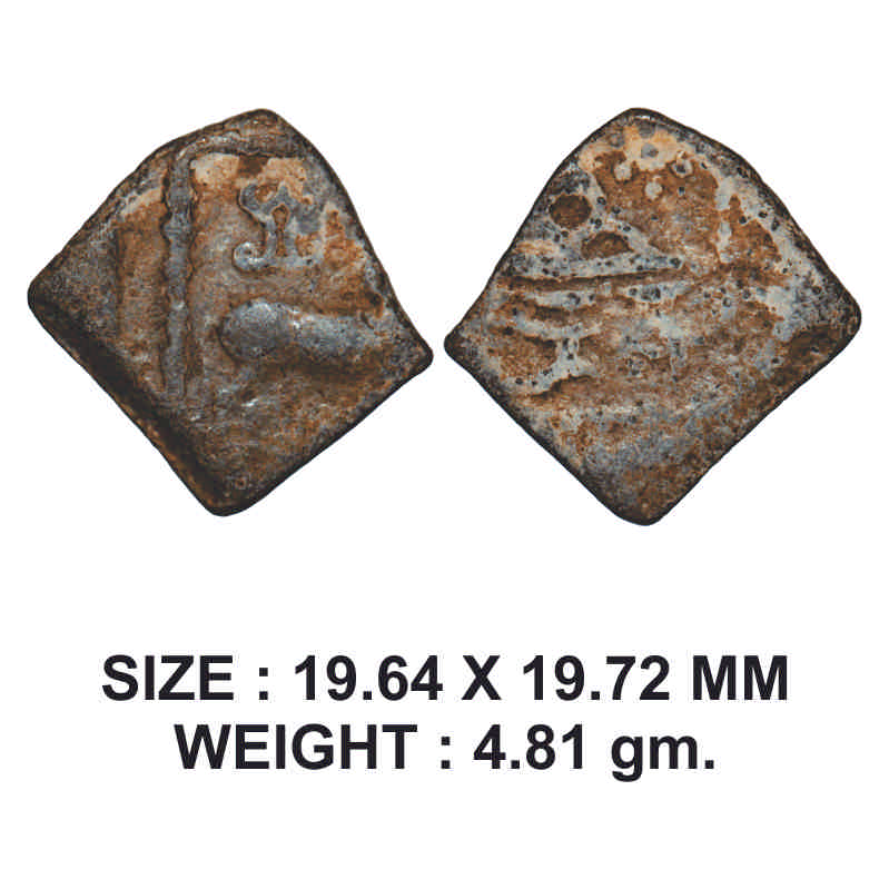 Western Kshatrapas, Rudrasena III, Lead, 1.85g, Obv: Humped bull standing to right side above Kalas...