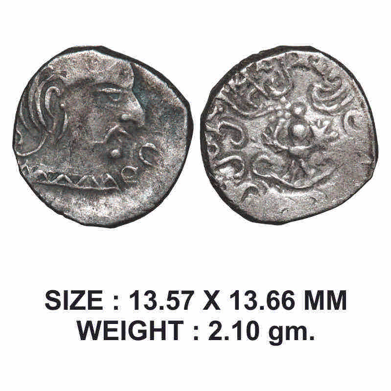 | Guptas, Chandragupta II, Silver Drachma, (380-415 CE), 2.10g, Obv: Bust of King, corrupted Greek Legend, Rev: Brahmi legend around, Garuda in centre. Mitch ACW 4821-4823. About Very Fine, Scarce. |