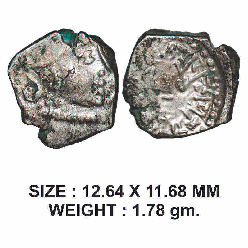 | Guptas, Skandagupta(c. 455-480 AD), Silver, Drachma, 1.78g, Bull type, Obv: Portrait to right, Rev: Brahmi legend with the name of the ruler around the motif, Nandi Bull to right. S. Kumar # TOTGE, pp. 355. Fine, Scarce. |
