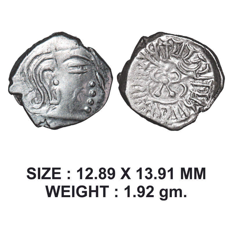 | Guptas, Skandagupta, Silver Drachm, 1.92g, Obv: King bust facing to right, Rev: Winged garuda in centre around Brahmi legend 'Paramabhagavata maharajadhiraja sri skandagupta kramaditya. S. Kumar, TOTGE, pp. 354. About Very Fine, Scarce. |